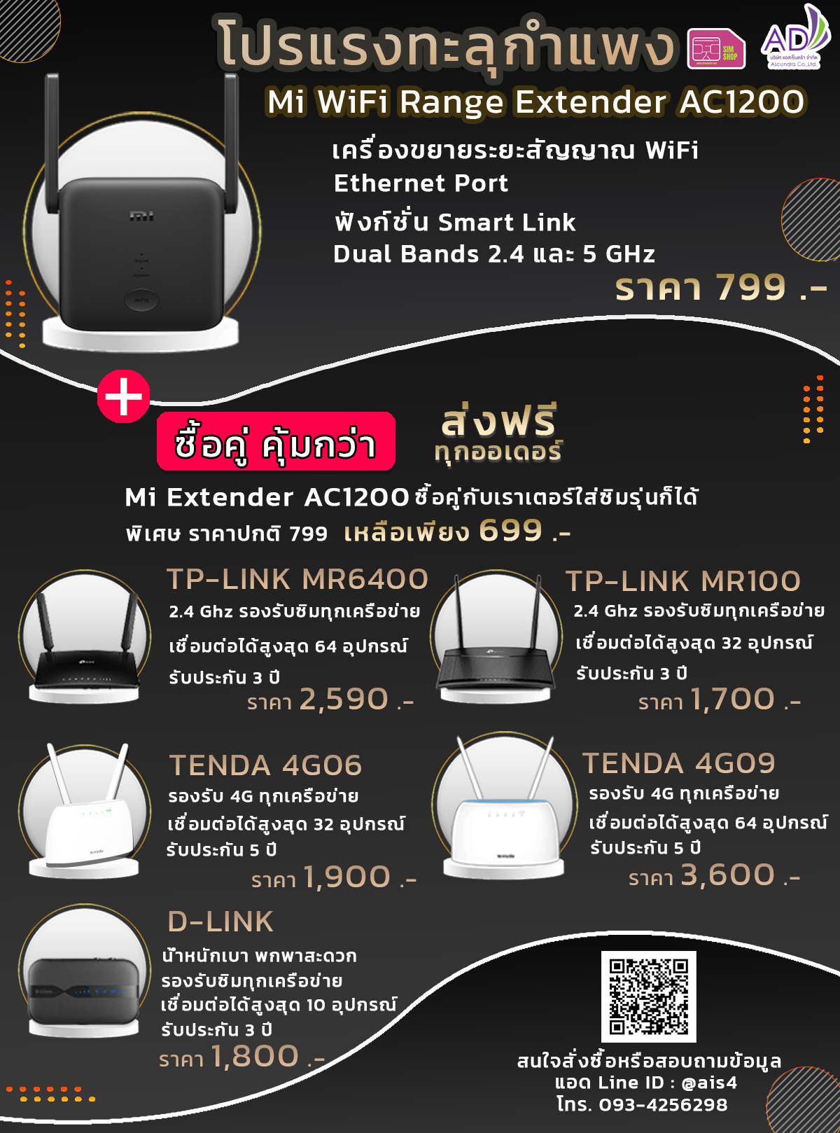 นอกจากนี้ทางเรายังจัดโปรเด็ดร่วมกับสินค้า IOT อย่างเช่น เราเตอร์ใส่ซิมตัวแรง อย่าง Tenda และ TP-Link และพอคเกจไวไฟสำหรับพกพาไปนอกสถานที่แบรนด์ D-Link คุ้มแบบนี้หาไม่ได้ที่ไหนแล้วนะคะ