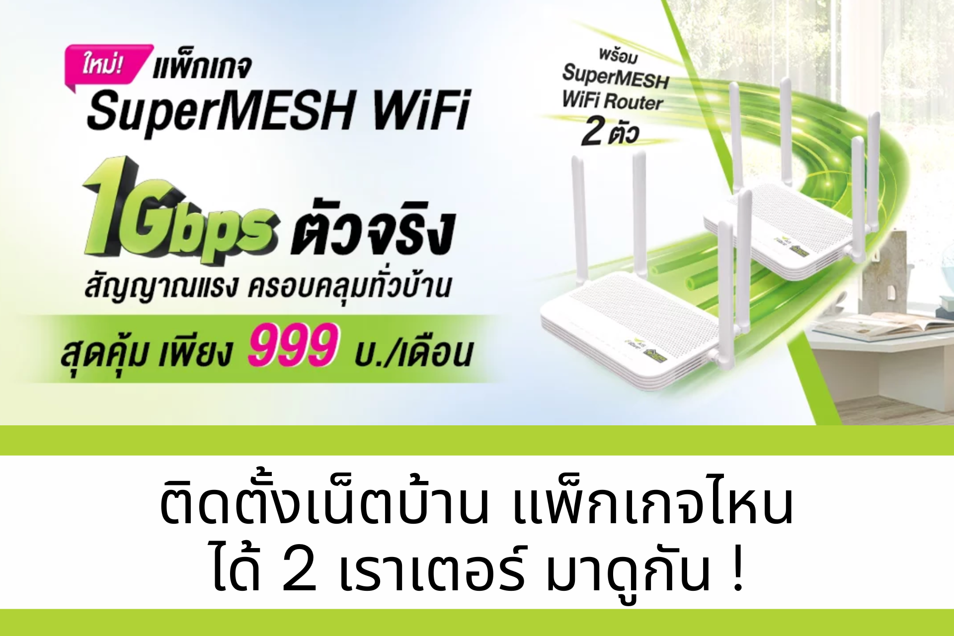Super Mesh ความเร็ว 1000/500 mbps ✅ ราคา 999 บาท (ไม่รวมภาษี) ✅ สัญญาการใช้งานขั้นต่ำ 24 เดือน ✅ ได้รับเร้าเตอร์ wifi 2 ตัว ❌ไม่มีซิมเน็ตแถม และไม่มีกล่องทีวี AIS PLAY BOX |